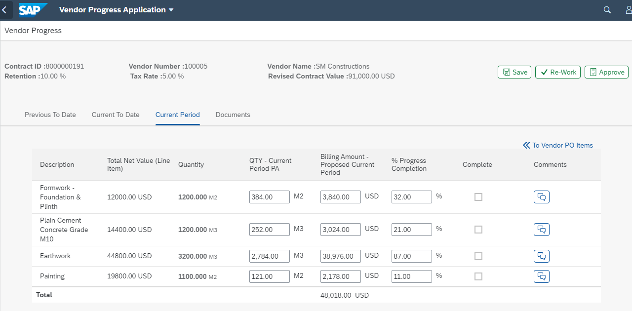 Master & child contract (e.g. Unit Rate, Milestone, T&M) details, Hold-back terms, documents for submission with approver & reviewer details for approval cycle can be set-up quickly through seamless integration with back-end SAP ERP (e.g. S/4HANA or ECC6.0).